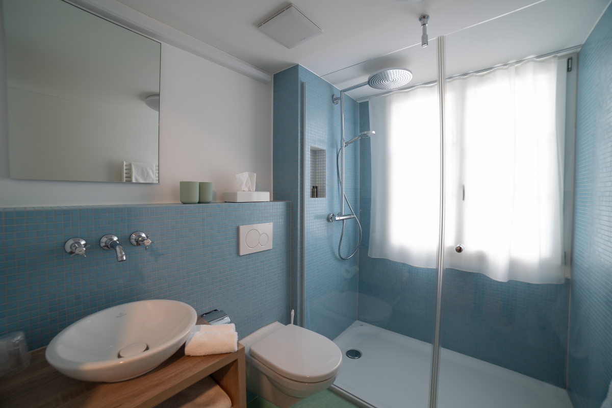 Modernes, zeitloses Bad mit grosszügiger Dusche. Freies WLAN ist im ganzen Haus verfügbar.