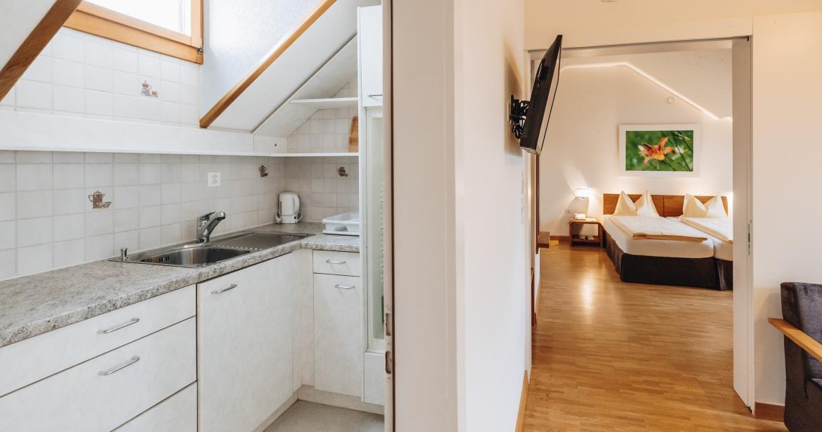 Bitte beachten Sie, dass sich das Dach-Appartement mit Balkon im oberen Stockwerk befindet, das nur über eine Treppe erreichbar ist.Zimmerausstattung