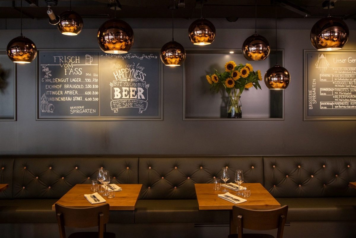 Das Restaurant Brasserie Spirgarten bietet saisonale und regionale Gerichte sowie eine große Auswahl an internationalen und schweizerischen Bierspezialitäten – perfekt, um den Tag stilvoll ausklingen zu lassen.
