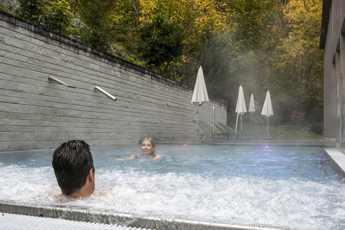 La suite junior Lilawadee Spa dispose d'un jacuzzi sur sa terrasse privée avec une vue magnifique sur le lac de Sarnen et les montagnes d'Obwald. Une douche à vapeur avec arômes et changement de lumière complète l'expérience spa dans la chambre.